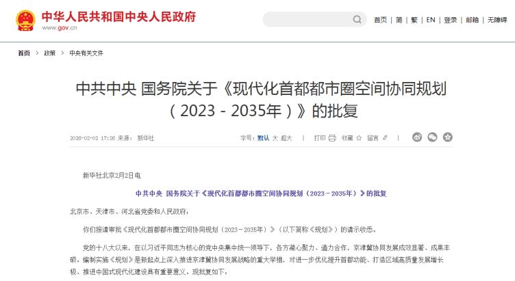 中共中央 国务院关于《现代化首都都市圈空间协同规划(2023-2035年)》的批复