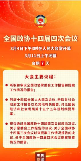 全国政协十四届四次会议将于4日下午在北京开幕。届时,中央广播电视总台所属中央电视台综合频道、新闻频道、中文国际频道、中国国际电视台各外语频道、4K超高清频道,中央人民广播电台中国之声、大湾区之声、中国国际广播电台环球资讯广播等频率将进行现场直播;央视新闻、央视频、央视网等中央重点新媒体平台将同步转播。