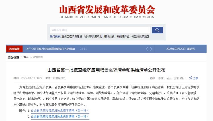 为促进我省低空经济发展,省发展改革委组织省直厅局、省属企业、各市发展改革委,征集梳理形成了山西省第一批低空经济应用场景需求清单和供给清单。两个清单涵盖生产作业(含农林植保、巡检、测绘勘查等)、低空运输(含物流运输、交通出行)、公共治理(含应急救援、医疗救护、城市治理)、低空消费(含旅游、航空运动)等4大类应用场景,需求100项,供给80项。现将两个清单予以公开发布,欢迎各类市场主体跟进对接参与,省发展改革委将积极做好服务工作。